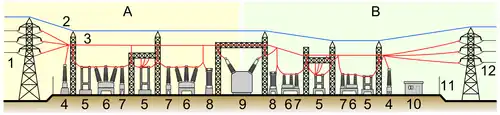 A transmission substation connects two or more transmission lines.[10] The simplest case is where all transmission lines have the same voltage. In such cases, substation contains high-voltage switches that allow lines to be connected or isolated for fault clearance or maintenance. A transmission station may have transformers to convert between two transmission voltages, voltage control/power factor correction devices such as capacitors, reactors or static VAR compensators and equipment such as phase shifting transformers to control power flow between two adjacent power systems.