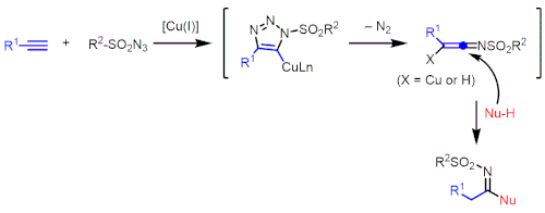 Cu-catalyzed multicomponent coupling is a notable process developed by Chang's group. In 2005, they published a highly efficient and mild catalytic three component coupling between an alkyne, sulfonyl azide, and amine.[8] Unlike click chemistry which generates 1,4-triazoles as products, in this case a Cu(I) catalyst, sulfonyl azide and alkyne generate ketenimine intermediate after releasing N2 gas. This electrophilic ketenimine intermediate reacts with amines and to generate asymmetric imines as products. Chang's group also showed water,[9] alcohols,[10] the C3 position of pyrrole[11] and other nucleophiles can be used in this reaction.