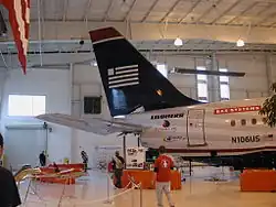 In January 2011, the Carolinas Aviation Museum acquired the entire airframe from the insurance company, AIG, who donated the aircraft to the museum.[52][53] The airframe was transported by road from its storage location at J Supor & Son Trucking & Rigging Co. Inc. in Kearny, New Jersey to the museum at Charlotte Douglas International Airport in Charlotte (where the aircraft was supposed to fly to on the day of the accident). The transportation took 7 days, between June 4 and 10, 2011, and covered 788 miles (1,268 km) through New Jersey, Delaware, Maryland, West Virginia, Virginia, and North Carolina.[54] Because the fuselage was transported in one piece, as it was when it was recovered from the river, the truck was 190 feet (58 m) long. Virtually everything except the passengers' personal belongings are still in the airplane. The landing gear pins, fire axe, and the manuals were still in the cockpit, and the Coke cans were still in the beverage carts.[55]