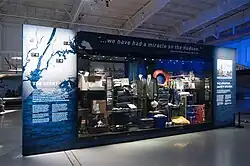 The airframe has been reassembled and was on display from 2011 to 2019 in the same configuration as it was when it was pulled out of the Hudson River in January 2009. The airframe is being preserved as opposed to restored with dents from the birds and tugboat.[56] In addition to the airframe, Captain Sullenberger and First Officer Skiles contributed their uniforms to the museum's 1549 exhibit.[57][58]