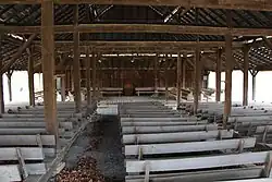 This one-story open air camp meeting shed with gable on hipped roof is rectangular, measures approximately 72 x 45 feet, and has a nave plan. The structure is supported by hewn and pegged timber truss work. It features a stage, unfinished plank pews, and a packed earth and sawdust floor. Sulphur Springs Methodist Campground was founded following the Great Revival of 1800. First meetings here may have occurred as early as 1815. In 1842 temporary brush arbors were abandoned for a more permanent structural complex. The present shed as well as the other buildings, now extinct, were reconstructed according to the same plan and shape and utilizing the same materials in 1900.[1][2]