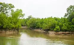 The region is intersected by a complex network of tidal waterways, mud flats and small islands of salt tolerant mangrove forests. The area is flooded with brackish water during high tides which mix with freshwater from inland rivers.