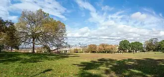In 1938, the city announced that it would rebuild the western section of Sunset Park as well.[56] By the next year, a WPA project was underway for the western part of the park. A steep 65-foot (20 m) slope was reduced to 40 feet (12 m) to lessen erosion, and a soldiers' monument was relocated. In addition, new concrete-block paths and drainage had been laid and an old comfort station had been destroyed.[51] Plans for minor modifications to the Sunset Play Center were filed in September 1940. By the early 1940s, WPA workers had finished the landscaping of the site, including new plantings, lawn restoration, and other rehabilitation.[52]