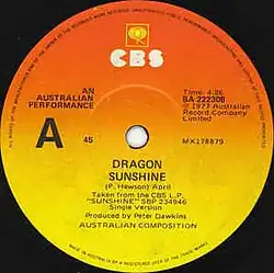 "Sunshine" is a song by New Zealand–Australian rock band Dragon released on July 1977, as the third and final single to be released from the band's third studio album Sunshine (1976). It peaked at number 36 on the Kent Music Report and remained in the chart for 15 weeks.[1]