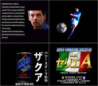 There are two alternative editions: Super Formation Soccer 95: della Serie A (UCC Xaqua)[1] and Super Formation Soccer 95: della Serie A (Extra Package).[1] The UCC Xaqua version is a kind of promotional edition, the idea was to promote a sports drink (energy drink) called Xaqua (manufactured by UCC and endorsed by the Italian Football League) with the participation or partnership of the Italian footballer Roberto Baggio (clearly visible on the back of the game packaging), via a contest held in 1995 in which the participants had to correctly answer three questions and return the postcard. The winners received the cartridge as a prize. Only 3,000 copies were distributed. In the opening scene, instead of having the cinematic intro sequence showing all the team logos, there is an advertisement of Xaqua featuring Roberto Baggio (1993 FIFA World Player of the Year). Also the box art is different, and in the UCC Xaqua version there is a strong hidden team called Xaqua. In the Extra Package edition there is a special book with all the 396 players' data.