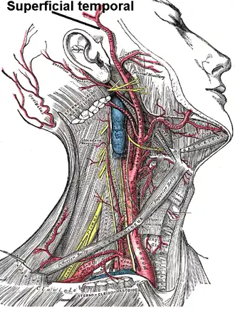 In human anatomy, the superficial temporal artery is a major artery of the head. It arises from the external carotid artery when it splits into the superficial temporal artery and maxillary artery.
