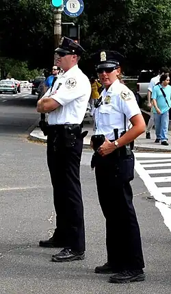 The Supreme Court of the United States Police Department (SCUSPD),[1] commonly referred to as the Supreme Court Police, is a United States federal security police agency responsible for security and law enforcement services concerning the properties, personnel, and visitors of the Supreme Court of the United States. The SCUSPD enforces federal and District of Columbia laws and regulations, as well as enforces regulations governing the Supreme Court Building and grounds as prescribed by the head of the SCUSPD (the Marshal of the United States Supreme Court) and as approved by the Chief Justice of the United States. In addition to more common law enforcement tasks, SCUSPD personnel, in conjunction with United States Marshals Service personnel, are responsible for providing personal protection details to Supreme Court justices (and the chief justice) both domestically and internationally, as well as the justices' homes. Sworn SCUSPD personnel may exercise law enforcement powers and carry firearms throughout the District of Columbia, and nationally when protecting SCOTUS justices or property; such authority is derived from 40 U.S.C. § 6121.