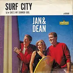 "Surf City" is a 1963 song recorded by the American music duo Jan and Dean about a fictitious surf spot where there are "two girls for every boy".[1] Written by Brian Wilson and Jan Berry,[2] it was the first surf song to become a national number-one hit.[3]
