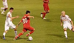 Suso was first recalled to a Liverpool matchday squad as they began their Champions League campaign on 16 September 2014 with a 2–1 win over Bulgarian club Ludogorets Razgrad, though he went unused.[18] A week later, in a League Cup third round match against Middlesbrough at Anfield, he replaced Lazar Marković in the 98th minute and scored his first goal for the club 11 minutes later in a 2–2 draw after extra time. He also scored twice in the subsequent penalty shoot-out, including the winner, as Liverpool won 14–13.[19]