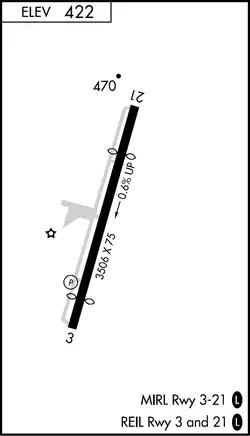 - Rwy 21 threshold displaced 756 feet (230 m)[1]
