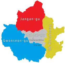 Suwon has experienced a number of administrative territory changes since the 1960s. In 1963, Suwon expanded greatly as 20 villages were incorporated from Hwaseong-gun.[41] In 1983, two more villages were acquired from Yongin.[42][18] In 1987, Suwon expanded westwards, acquiring another two villages from Hwaseong.[43][44][18] Gwonseon District and Paldal District were established in 1988.[18] It received more territory from Hwaseong and Yongin in 1994,[45][18] and again from Hwaseong in 1995.[18] It established Yeongtong District in 2003.[18]
