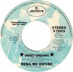 Entertainer Reba McEntire recorded her version on Out of a Dream, her second album, in 1979. "Sweet Dreams" gave her her first solo top 20 hit, peaking at No. 19 on the Hot Country Songs chart. For many years until March 15, 1991, McEntire closed her concerts with an a cappella version.
