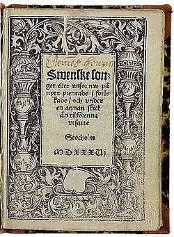 Swenske songer eller wisor nw på nytt prentade / forökade / och under en annan skick än tilförenna utsatte, often abbreviated as just Swenske songer eller wisor 1536, is the first preserved hymnal published in the Swedish language and was released in 1536.[1] It consists of 47 songs or hymns,[2] all of which have been issued anonymously.[1] Olaus Petri, a major contributor to the Protestant Reformation in Sweden, is however believed to have authored most of them, with contributions from Ericus Olai and Laurentius Petri.[1] A large amount are translations of Latin and German hymns.[1]