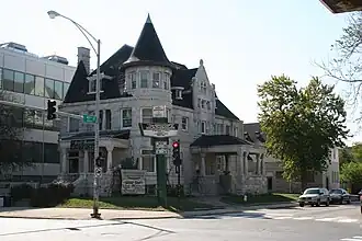 The Swift House is a historic house at 4500 S. Michigan Avenue in the Grand Boulevard community area of Chicago, Illinois. The house was built in 1892 for Edward Morris and his wife Helen Swift Morris. Both of the owners had close ties to Chicago's meatpacking industry; Edward was the president of Morris & Company, while Helen was the daughter of Gustavus Franklin Swift, the founder of Swift & Company. The Richardsonian Romanesque home was most likely designed by Chicago architects Willett & Pashley. Its design includes a rusticated stone exterior, porches supported by stone columns, a dentillated cornice, and a turret and stone gable projecting from the roof. In addition to being a home for several different owners, the house has also served as a funeral home and as the headquarters of the Chicago Urban League.[2]