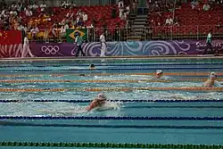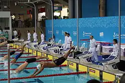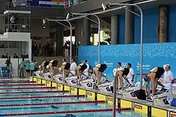 ![]() Pictogram used for Aquatics, with diving (left) and swimming (right) represented. | |