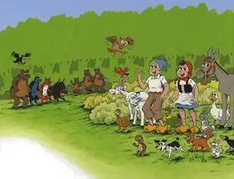 Sylvain et Sylvette, are the main characters of the comics series. Orphans, they live alone and autonomously in a house that they call their "cottage", in the middle of the forest. They live with several animals referred in the series as their "friends" and have a very simple way of life, wearing clogs and eating with picking and fishing. Sometimes they pass to Laville (literally "Thetown" in French), a small village near their house, when they need a doctor or a veterinary for example. However, four starving animals, the "comperes", who live in a cavern not far from the cottage, seek to catch their animals or to steal their food. The atmosphere of the series is largely humoristic and the so-called villains' attempt to catch animals always fails. In some albums, Sylvain and Sylvette live more adventurous situations than the usual fight against the Comperes, particularly when Tartalo, a scientist, intervenes in the story.