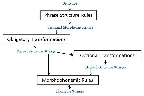 Chomsky's transformational grammar has three parts: phrase structure rules, transformational rules and morphophonemic rules.[68] The phrase structure rules are used for expanding lexical categories and for substitutions. These yield a string of morphemes. A transformational rule "operates on a given string ... with a given constituent structure and converts it into a new string with a new derived constituent structure."[8] It "may rearrange strings or may add or delete morphemes."[69] Transformational rules are of two kinds: obligatory or optional. Obligatory transformations applied on the "terminal strings" of the grammar produce the "kernel of the language".[68] Kernel sentences are simple, active, declarative and affirmative sentences. To produce passive, negative, interrogative or complex sentences, one or more optional transformation rules must be applied in a particular order to the kernel sentences. At the final stage of the grammar, morphophonemic rules convert a string of words into a string of phonemes.[69] Chomsky then applies this idea of transformational rules in the English auxiliary verb system.[70]