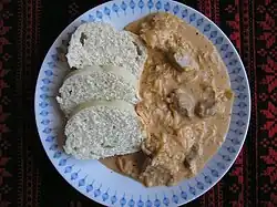 It is typically served with slices of a bread-like dumpling, accompanied by a light, spicy red wine (such as kadarka), cold sour cream, and chili pepper cream.
