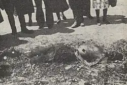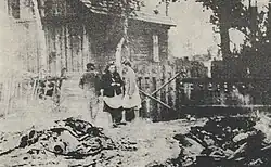 On the morning of May 18, 1943, a punitive expedition composed of German gendarmes and members of the Ukrainian Auxiliary Police[a] from Biłgoraj and Tarnogród arrived in Szarajówka.[1] Around 9:00 a.m., villagers noticed the village was encircled, sparking panic among them. Soon after, the Germans and Ukrainians entered the village, forcing residents out of their homes and gathering them in the square opposite farmer Saniak's farm.[6] Initially, women and children were treated with some leniency, while men endured harsh interrogations in attempts to extract information about Polish partisans.[7][8] Several individuals suffered severe beatings, rendering them unable to walk to the execution site unaided.[9] Meanwhile, the assailants looted livestock and valuable belongings from the farms.[8]