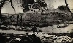 The remains of the victims were buried in a mass grave, and after the war, a sandstone monument was erected there.[18]