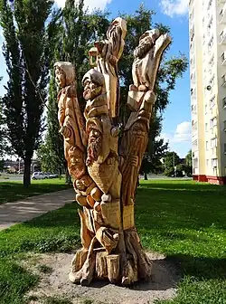 Realized by Bydgoszcz sculptor Mirosław Kufel out of a withered poplar trunk, it represents 7 dwarfs overlooking 2 geese, recalling a short story Orphan Marysia and Dwarfs, by Maria Konopnicka.[62]