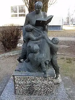 Made out of bronze, the sculpture portrays the seated poet reading her poems to three children around her. It has been realized by Krystyna Panasik.[61]