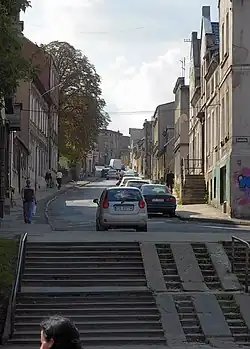 The street is an old communication route connecting Bydgoszcz with settlements located in south Kujavia. The road used a ravine in the slope of the Bydgoszcz urstromtal, stretching towards the forest. Along the axis was built in the 13th century Saint Giles church, near the Brda river, probably funded by Casimir I of Kuyavia.[24] In the 17th and 18th centuries, the route connected the town with southern villages such as Rupienica or Glinki. Further on, past the forest, it led to Przyłęki and towards Jezioro Jezuickie (English: Jesuit Lake).[25] In 1920, as Bydgoszcz territory expanded, a dozen of surrounding suburban communes were included in the city borders (including Szwederowo, Bielice and Rupienica): as a consequence, Kujawska street has been running since that year entirely within the municipal administrative boundaries.[26] In the 1980s, the street was thoroughly modernized, widened up to two carriageways with 3 lanes and the large Kujawski roundabout built, with underground passages which were never used,[27] then razed in 2019.[28] The southern segment of Kujawska street was renamed in 2005, Aleja Jana Pawła II in honor of John Paul II.