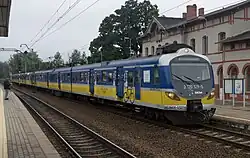 The EMUs have doors on both sides of the train and therefore can easily be used in either direction. Even though the SKM line has stops with high platforms, the units can be used on low platform stations as well. The most common livery for SKM electric multiple units is yellow and blue. The exception are units with advertising labels, which are coloured according to the advertiser's wishes. The SKM company logo is placed on both sides of the unit, next to the doors.
