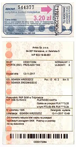 The layout of the ticket has changed over time. At first, tickets were identical on all local lines, and were small cardboard rectangles, often with a hole pierced in the middle. Tickets then became orange, with a white stripe on one end for stamping information about the station and time of validation. The SKM then moved to light blue tickets, also with a white stripe which were only valid on its lines. Originally, this new layout had a list of stops printed on the reverse. Recently, this has been replaced by advertisements or information about the possibility of advertising. There are also blank tickets, sold by train conductors to sell tickets at stops where no ticket office is available. These have a list of stops with boxes to note start and destination of the journey, type of discount (if any) and number of tickets. An extra fee for sale on the train can also be noted on these tickets, for instance, if a passenger boards at a stop where he could buy a ticket normally.