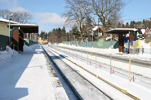 Tåsen has two platforms, each with a wooden shed.[9] The sheds are drawn by Arne Henriksen in a minimalist and standardized style with constructions of wood and steel.[10][11] The station is located in Tåsenveien, near Tåsen school,[12][13] shortly after a bridge over the circumferential highway Norwegian National Road 150.[14] There is an underpass that was constructed in the 1960s on the other side of the bridge, that allows pedestrian access to the Tåsen senter mall.[15] Tåsen serves mainly the residential area Tåsen, but also Korsvoll and Nordberg.[16][17][18]