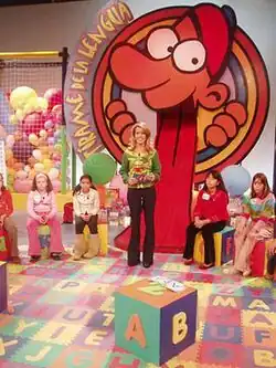 Tirame de la Lengua (Make Me Speak or, literally, Pull My Tongue) is a TV game show broadcast on Televisión Española (TVE) and TVE Internacional. The teams are the Lenguetazos and Lenguetones. Children between 9 and 12 years old participate, and slide down an enormous tongue to enter the set.[1] During the half hour show, the contestants play games like Letter Soup and Trabalenguas (tongue twisters) with a lollipop in their mouths. An animated Miguel de Cervantes judges the results of the teams.
