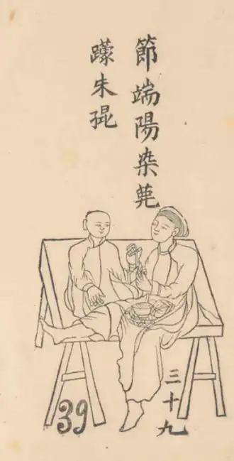 ![]() A mother and child during Tết Đoan Dương (節端陽) dying her child's nails to ward off bad spirits.