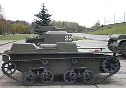 Like other light tanks of its time, the T-38 was designed for reconnaissance and infantry support roles. As a scout tank the T-38 had the advantages of a very low silhouette and good long-range mobility through its ability to swim. The T-38 was also intended to be air-portable; during the Kiev maneuvers in 1936, the tanks were transported by Tupolev TB-3 bombers, mounted under the fuselage.[4] Infantry battalions were each issued 38 T-38s, with 50 being designated for each airborne armored battalions. However, the thin armor and single machinegun armament made the tank of only limited use in combat and the lack of a radio in most T-38s was a serious limitation for a reconnaissance vehicle. The T-38 also struggled with carrying any excess cargo across water. The tank was incapable of supporting the weight of two infantrymen while floating, and overloads of 120-150 kilos would cause the commander's hatch to flood, sinking the vehicle.[2] These flaws were to be fixed by the T-38's successor, the T-40, but only a small number were built before the outbreak of World War II, leaving the T-37A and T-38 to form the bulk of the Red Army's amphibious tanks.[5]