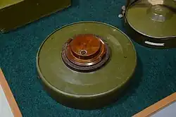 The TM-62 is a series of Soviet anti-tank blast mines produced in various variants. It served as the primary anti-tank landmine for the Soviet military.[4] It has a central fuze and typically a 7.5 kilograms (17 lb) explosive charge, but the variants differ greatly in detail. The mine can be laid manually or automatically from a mine laying machine including the PMR-1, PMR-2 wheeled towed mine layers, the GMZ-3 tracked mine laying vehicle and the VMR-2 helicopter mine laying system. The TM-62 can be fitted with the same fuzes as the TM-72, which include MVN-72 and MVN-80 fuzes, which are vibration and magnetism sensitive. The mine was used in the 2022 Russian invasion of Ukraine for antitank and antipersonnel use (as satchel charges).[3]