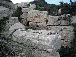 The most interesting and largest water cistern on the site, lies slightly up the hill from the villa. It is around ten metres by ten metres in size, with a depth of four metres. The roof is supported by twelve large square pillars. This is one of the most impressive structures from the Punic-Roman period which survive in Malta.[5]