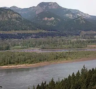 Table Mountain is a peak rising on the north side of the Columbia River in Washington state, about 4 miles (6.4 km) north-northwest of Bonneville Dam. It is one of the most spectacular landmarks of the Columbia River Gorge. Its southeast face drops 2,400 feet (730 m) in less than one horizontal mile (1.6 km.), and is topped by an almost vertical 800-foot (240 m) cliff.[3] Table Mountain is joined by the similar Greenleaf Peak to the northeast, and also by Hamilton Mountain to the southwest, which is lower, (2,438 ft or 743 m), but similarly steep and much closer to the Columbia. Together these peaks form an impressive group on the Washington side of the Gorge.