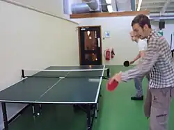 Table squash is a sport for two players which is an evolution of table tennis and uses similar rules and equipment. The game is played by placing a table tennis table against a playing wall with the net remaining on the table perpendicular to the wall. Each player stands on the opposite side of the table facing the wall on either side of an imaginary line as if the net was extended backwards. Players each use table tennis rackets and take turns to play a table tennis ball off the playing wall onto the table on the opponent's side of the net, except on serves where the ball must first bounce on the server's side of the net on the table.