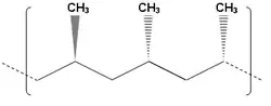 Isotactic polymers are composed of isotactic macromolecules (IUPAC definition).[7] In isotactic macromolecules, all the substituents are located on the same side of the macromolecular backbone. An isotactic macromolecule consists of 100% m diads, though IUPAC also allows the term for macromolecules with at least 95% m diads if that looser usage is explained.[3] Polypropylene formed by Ziegler–Natta catalysis is an example of an isotactic polymer.[8] Isotactic polymers are usually semicrystalline[9] and generally (but not exclusively) crystallize in a helical configuration.[10][11]