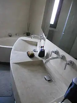 Tadelakt (Moroccan Arabic: تدلاكت, romanized: tadlākt) is a waterproof plaster surface used in Moroccan architecture to make baths, sinks, water vessels, interior and exterior walls, ceilings, roofs, and floors. It is made from lime plaster, which is rammed, polished, and treated with soap to make it waterproof and water-repellent.[1] Tadelakt is labour-intensive to install, but durable.[2] Since it is applied as a paste, tadelakt has a soft, undulating character, it can form curves, and it is seamless. Pigment can be added to give it any colour, but deep red is traditional.[3] It may have a shiny or matte finish.