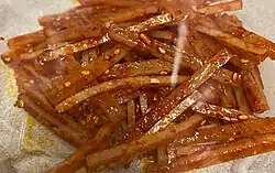 Taegu (대구) is a Korean term for codfish.[1] While commercial taegu is commonly made with dried cod, most home recipes still use dried shredded cuttlefish as it is more widely familiar and available. Taegu is quite similar to the original Korean ojingeo-chae-bokkeum recipe in terms of ingredients. However, Hawaii recipes generally do not "bokkeum," or stir-fry, the seafood nor cook the seasonings. Rather all the ingredients are combined and left to marinate.[2][3][4]