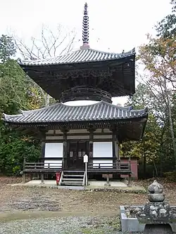 A tahōtō (多宝塔, lit. 'many-jewelled pagoda'; pronounced [tahoːtoː]) is a form of Japanese pagoda found primarily at Esoteric Shingon and Tendai school Buddhist temples. It is unique among pagodas because it has an even number of stories (two). (The second story has a balustrade and seems habitable, but is nonetheless inaccessible and offers no usable space.)[1] Its name alludes to Tahō Nyorai, who appears seated in a many-jewelled pagoda in the eleventh chapter of the Lotus Sutra.[2][3] With square lower and cylindrical upper parts, a mokoshi 'skirt roof', a pyramidal roof, and a finial, the tahōtō or the larger daitō was one of the seven halls of a Shingon temple.[4] After the Heian period, the construction of pagodas in general declined, and new tahōtō became rare. Six examples, of which that at Ishiyama-dera (1194) is the earliest, have been designated National Treasures.[5] There are no examples in China, whether architectural or pictorial, of anything that resembles the tahōtō, although there is a Song dynasty textual reference to a tahōtō with an encircling chamber'.[6]