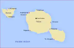 Before the arrival of the Europeans, the island was divided into territories, each dominated by a single clan. The most important clans were the closely related Teva i Uta (Teva of the Interior) and the Teva i Tai (Teva of the Sea)[19] whose combined territory extended from the peninsula in the south of Tahiti Nui.[20]