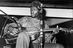 Mahal leads with his thumb and middle finger when fingerpicking, rather than with his index finger as the majority of guitar players do. "I play with a flatpick," he says, "when I do a lot of blues leads."[7] Early in his musical career Mahal studied the various styles of his favorite blues singers, including musicians like Jimmy Reed, Son House, Sleepy John Estes, Big Mama Thornton, Howlin' Wolf, Mississippi John Hurt, and Sonny Terry. He describes his hanging out at clubs like Club 47 in Massachusetts and Ash Grove in Los Angeles as "basic building blocks in the development of his music."[31] Considered to be a scholar of blues music, his studies of ethnomusicology at the University of Massachusetts Amherst would come to introduce him further to the folk music of the Caribbean and West Africa. Over time he incorporated more and more African roots music into his musical palette, embracing elements of reggae, calypso,[12] jazz, zydeco, R&B, gospel music, and the country blues—each of which having "served as the foundation of his unique sound."[3] According to The Rough Guide to Rock, "It has been said that Taj Mahal was one of the first major artists, if not the first, to pursue the possibilities of world music. Even the blues he was playing in the early 70s – Recycling The Blues & Other Related Stuff (1972), Mo' Roots (1974) – showed an aptitude for spicing the mix with flavours that always kept him a yard or so distant from being an out-and-out blues performer."[12] Concerning his voice, author David Evans writes that Mahal has "an extraordinary voice that ranges from gruff and gritty to smooth and sultry."[1]