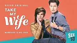 Take My Wife is an American sitcom on the Seeso comedy subscription streaming service. The show follows former real-life couple Cameron Esposito and River Butcher as they share their lives as stand-up comics who are balancing work, relationships, and the breaking down of gender barriers.[1] On December 19, 2016, Seeso renewed the series for a second season.[2] On August 9, 2017, Seeso announced the shutdown of its service by the end of the year, leaving Take My Wife without a home. On March 5, 2018, it was announced that season 1 and the previously unaired season 2 were now available on iTunes (US) and would be available on the Starz app starting May 1, 2018. Take My Wife is also now available on iTunes in the UK (as of April 30, 2018).[3]