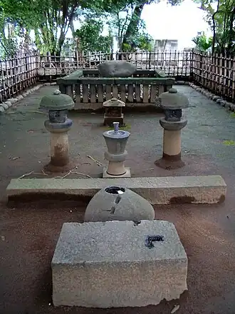 Takuan died in Edo in 1645. In the moments before his death, he wrote the kanji for "dream" (yume 夢), and laid down his brush. He also left behind a will stating that a "tombstone must not be built" and that he should be buried without any ceremony in an unmarked grave. His disciples promptly erected gravestones at the temple of Tōkai-ji (東海寺) and also at the temple of Sukyō-ji (宗鏡寺) in Izushi. His grave at Tōkai-ji was proclaimed a National Historic Site in 1926.[3]