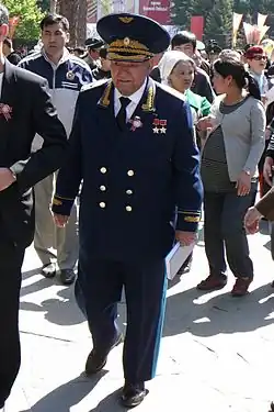For completing 155 ground attack missions flying an Il-2, he was nominated for the title Hero of the Soviet Union on 27 June 1944. He received the title on 26 October that year.[6] On 15 March 1945 he was nominated for a second gold star for having flown 275 missions, which he received after the war on 27 June. By the end of the war he had flown 305 sorties on the Il-2; in addition to attacking ground targets on those missions he had personally shot down four Bf 109, one Ju 87, and gained two group aerial victories.[7][8]