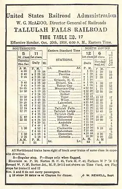 The Tallulah Falls Railway, also known as the Tallulah Falls Railroad, "The TF" and "TF & Huckleberry," was a railroad based in Tallulah Falls, Georgia, U.S. which ran from Cornelia, Georgia to Franklin, North Carolina. It was commissioned by the Georgia General Assembly on January 27, 1854, and conducted its final run on March 25, 1961.