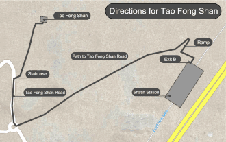 Tao Fong Shan is located in the rural part of Sha Tin, but can be easily reached by walking. From East Rail line's Sha Tin station, it only takes 20 minutes to get to the centre via a hiking trail.[12]