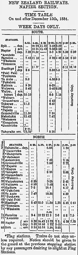 - ^ "RAILWAY TIME-TABLE. HASTINGS STANDARD". paperspast.natlib.govt.nz. 28 April 1896. Retrieved 16 June 2022.