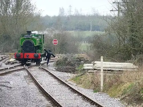 Taw Valley Halt railway station is the current (and temporary) southern terminus of the Swindon and Cricklade Railway, a heritage railway line in Wiltshire, South-West England. The restored line was extended to the site of the halt in 2012,[1] and the halt was opened in 2014. The halt is at the point where the new track diverges from the original route of the Midland and South Western Junction Railway. There is a short siding on the original trackbed.